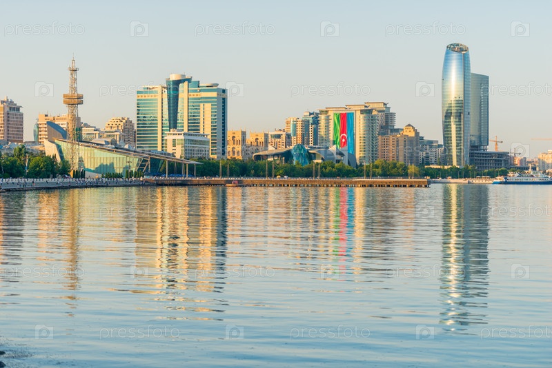 вид на горизонт с Бакинского бульвара или набережной Каспийского моря. Баку является столицей и крупнейшим городом Азербайджана и Кавказского региона