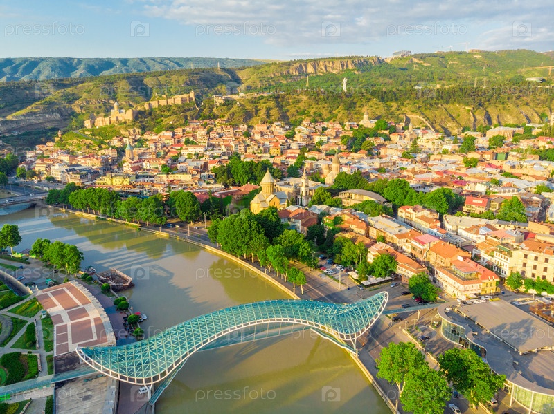 Тбилиси, Грузия - 22 июня 2018 года: Прекрасный вид на реку Кура и мост мира в Тбилиси, Грузия