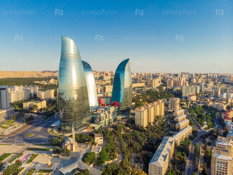 Баку, Азербайджан - 24 июня 2018 года: Центр города и вид на башни Пламени в летнее время