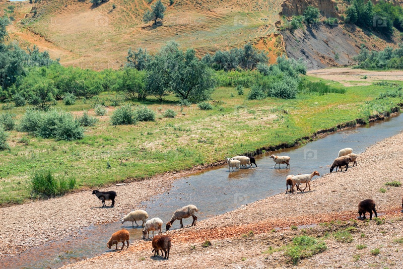 Стадо овец пасется в горах и пьет из горной реки