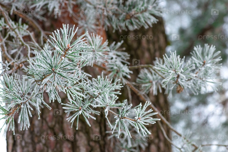 Ветка хвойного дерева, посыпанная снегом в лесу крупным планом зимой