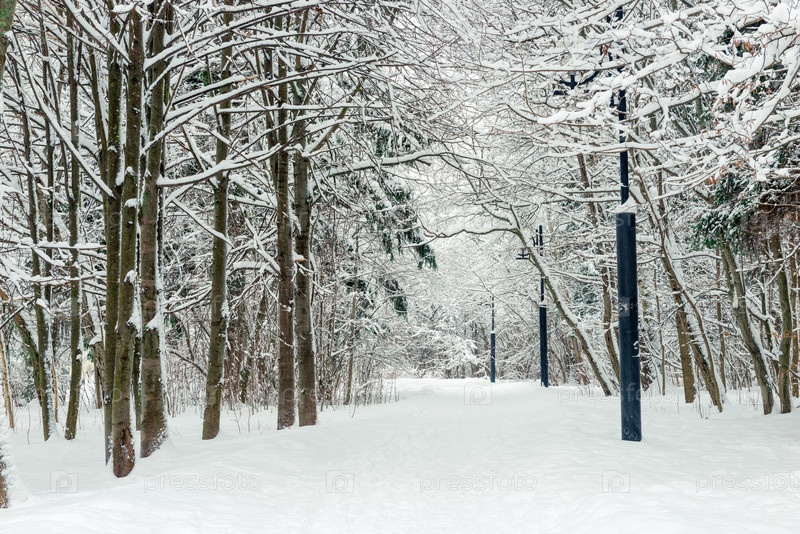 Живописная аллея в снежном лесу, широкая дорога в зимнем лесу