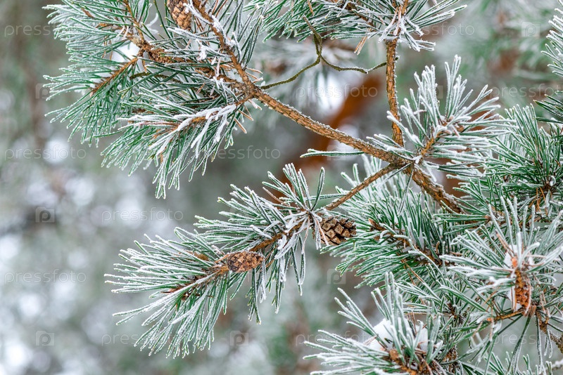 Ветка хвойного дерева, посыпанная снегом в лесу крупным планом зимой