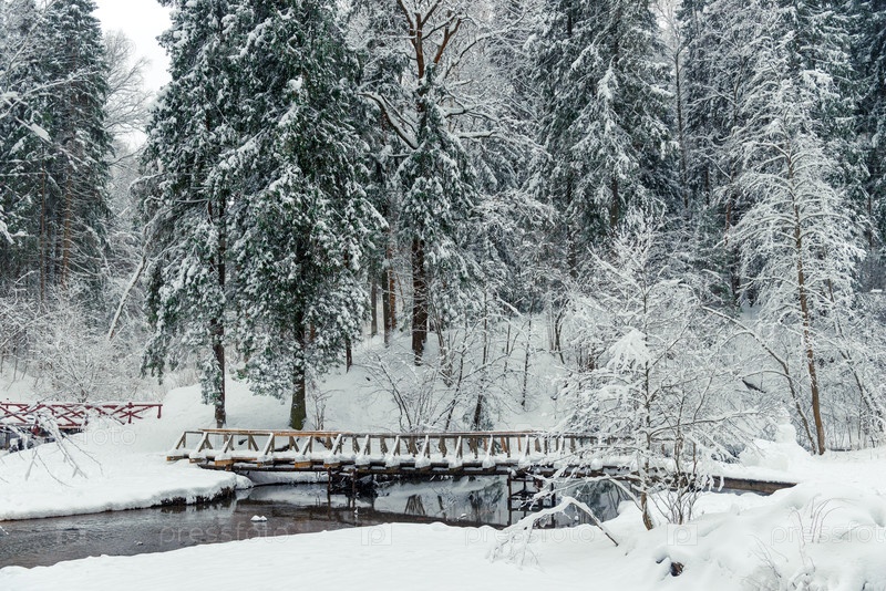 Деревянный мост через реку в зимнем снежном лесу, красивый пейзаж