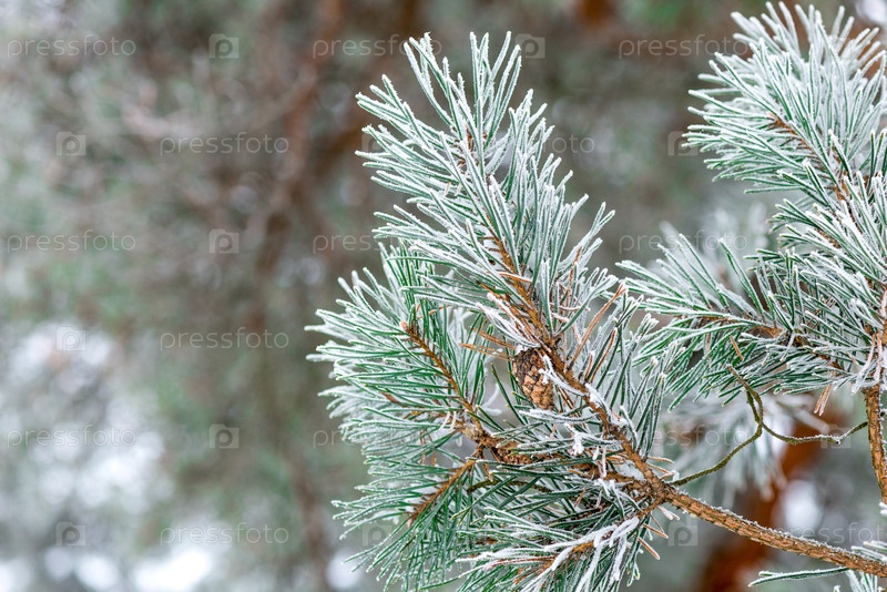 Ветка хвойного дерева, посыпанная снегом в лесу крупным планом зимой