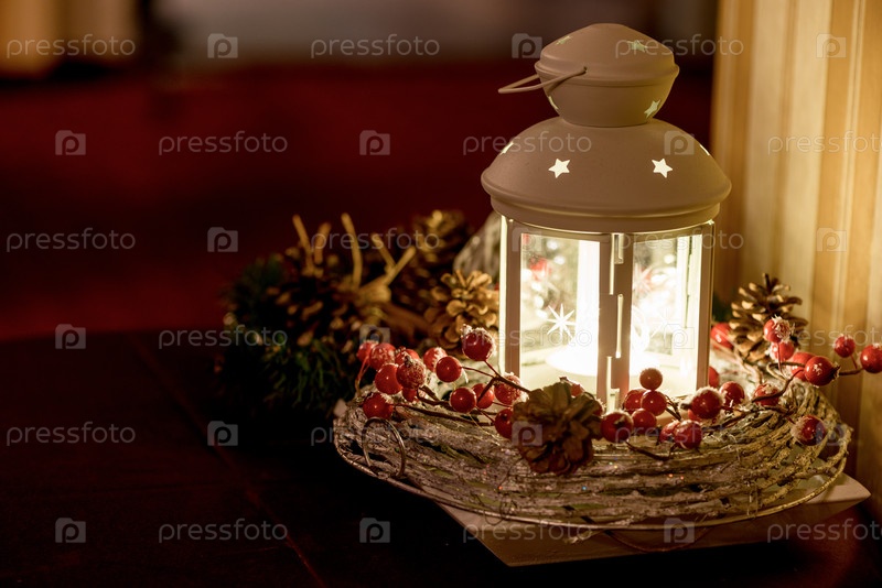 Рождественская композиция яркого света светящегося фонаря, зеленых ветвей пихты