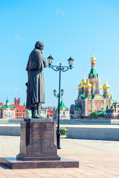 Статуя писателя Николая Васильевича Гоголя на фоне собора Благовещения Пресвятой Богородицы в Йошкар-Оле