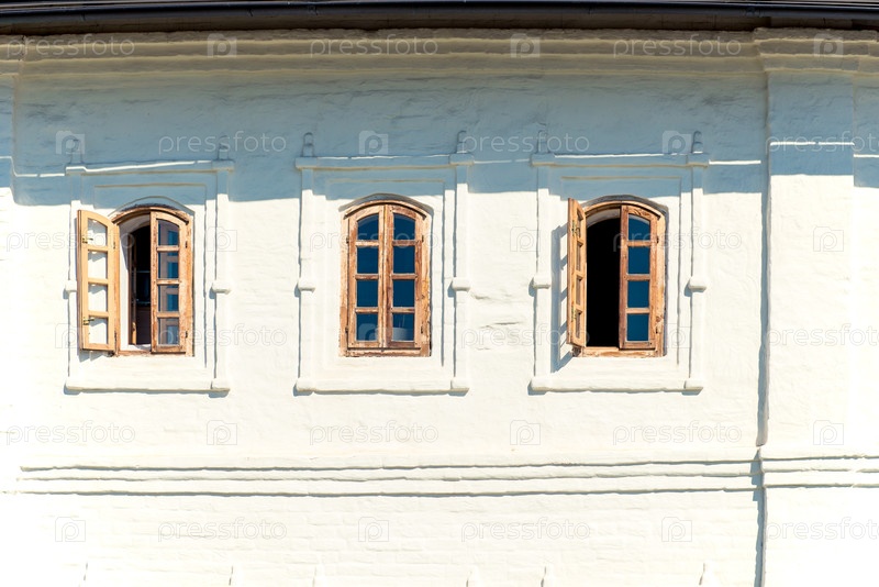 Окна старого белокаменного здания в русском стиле на территории Казанского Кремля. Россия