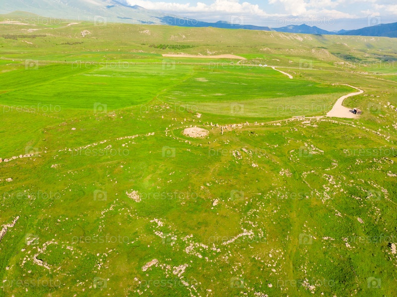Большие камни в поле с круглыми отверстиями в Караундже - Армянский Стоунхендж, Зоратс Карер, Армения вид сверху