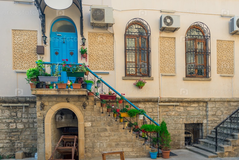 Винтажная балконная лестница с красочными цветами и дверью