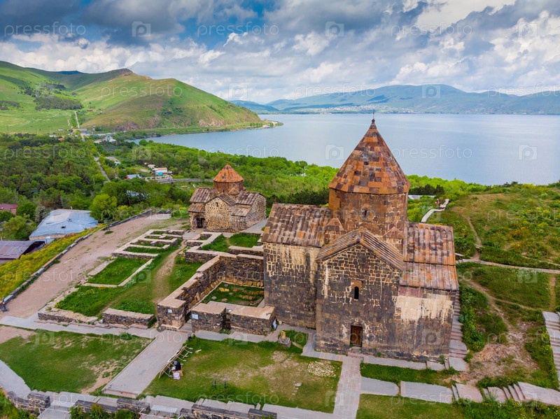 Монастырь Севанаванк драматическое небо на закате, Армения