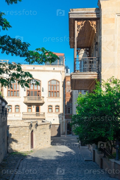 Пустая улица в старом городе Ичери Шехер Баку, Азербайджан. Архитектура Старого города Баку. Внутренние здания города