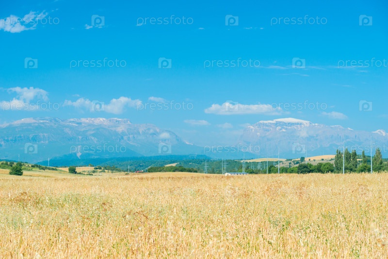 Желтый цветочный луг с покрытыми снегом горами красивый пейзаж