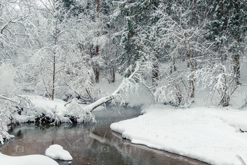 Снежный зимний лес и текущая река. Живописный пейзаж в зимний день в лесу