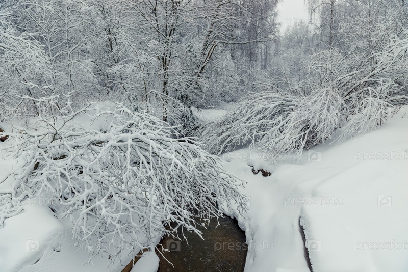 Снежный зимний лес и текущая река. Живописный пейзаж в зимний день в лесу