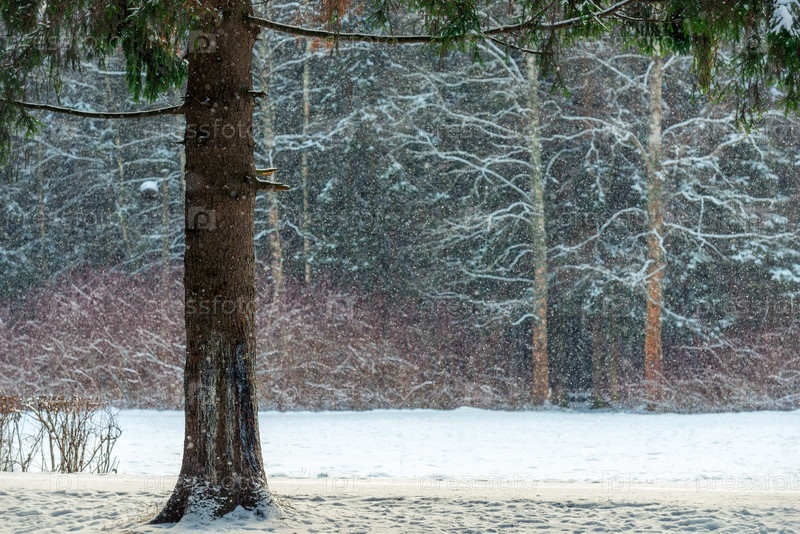 Буря и метель в зимнем лесу. Живописный лесной зимний пейзаж