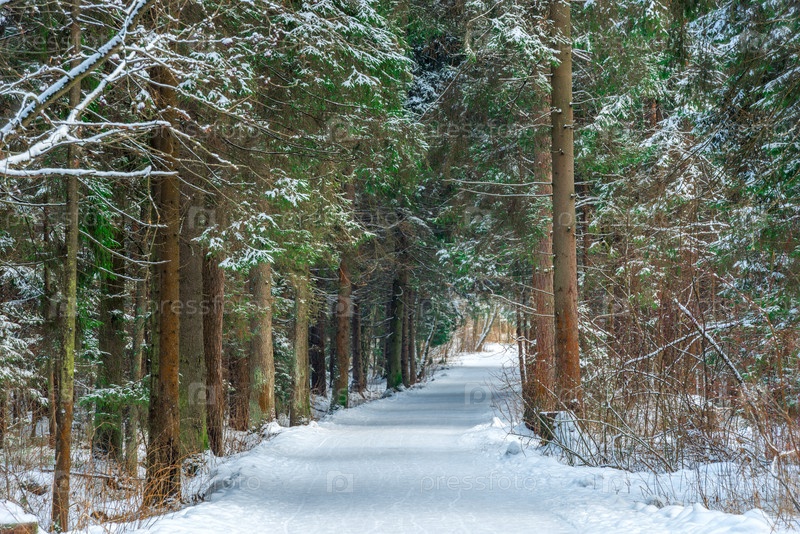 Живописная аллея в снежном лесу, широкая дорога в зимнем лесу