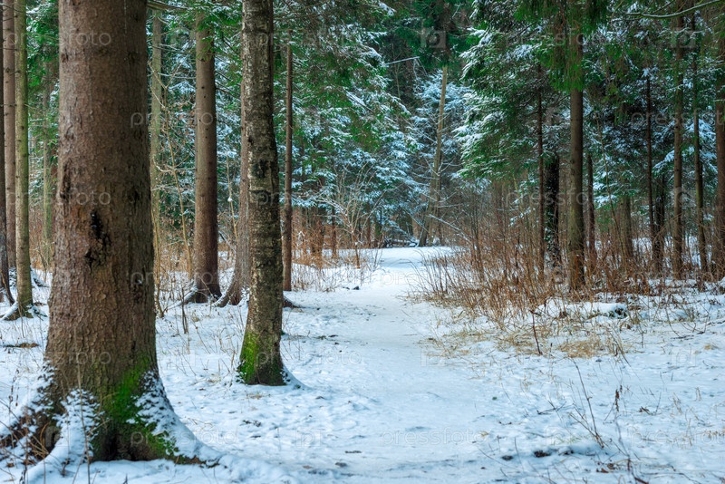 Живописная аллея в снежном лесу, широкая дорога в зимнем лесу