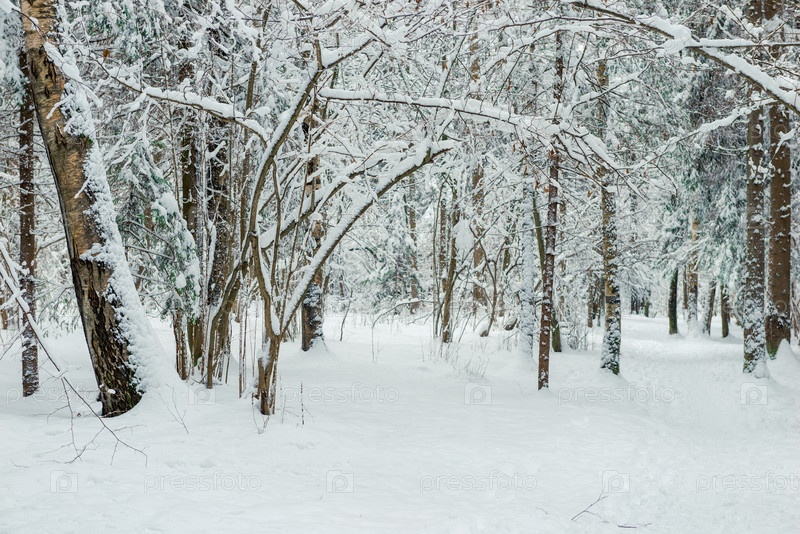 Пейзаж, красивый зимний смешанный лес покрыт белым снегом