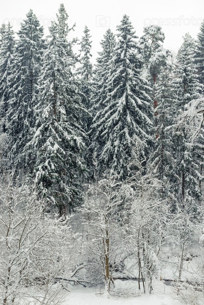 Пейзаж, красивый зимний смешанный лес, покрытый белым снегом