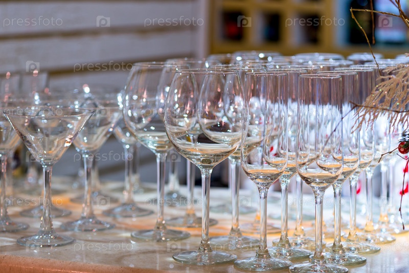 Набор пустых стеклянных кубков для шампанского, вина, воды стоят в ряд на столе