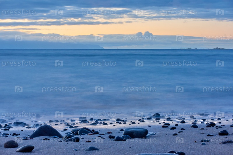 Море после захода солнца и галечный пляж на рассвете