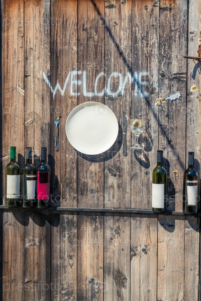 Декор на стене ресторана винных бутылок и тарелка с надписью Добро пожаловать