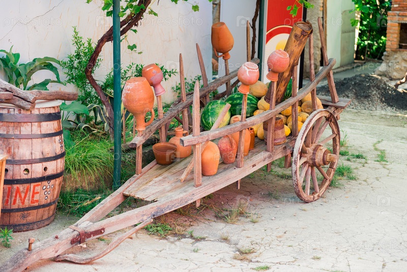 Деревянная тележка, загруженная глиняными горшками для вина