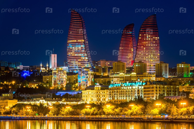 Баку, Азербайджан - 23 июня 2018 года: Цветные огни на огненных башнях, символ баку ночью