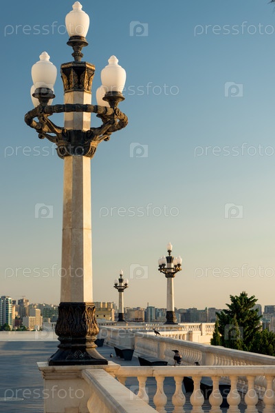 Красивая мраморная балюстрада с панорамным видом на центр города, Баку, Азербайджан