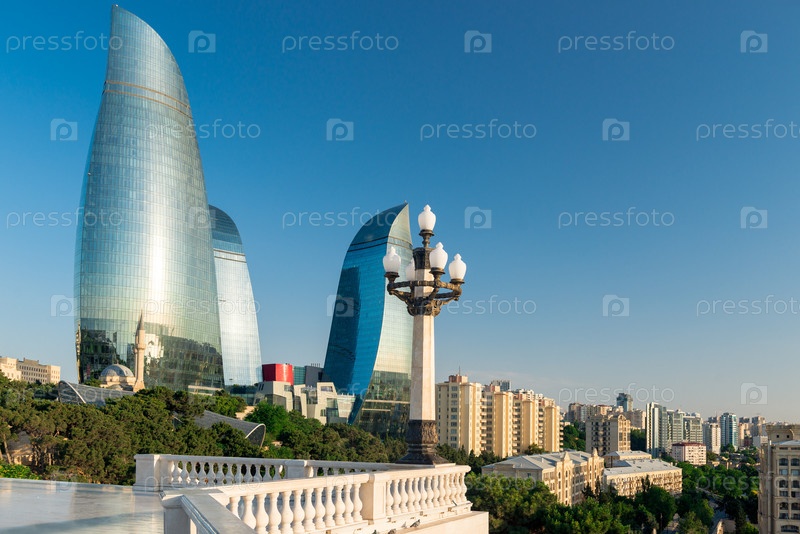 Баку, Азербайджан - 23 июня 2018 года: Центр города и вид на башни Пламени в летнее время