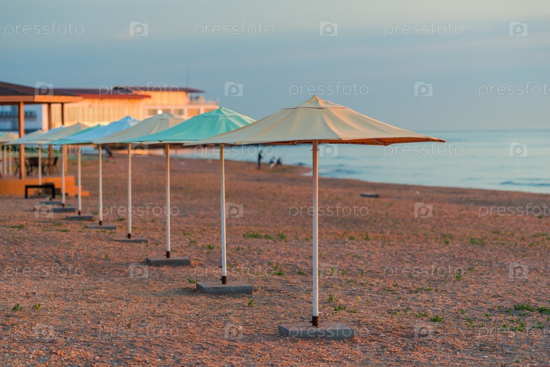 Ряд пляжных зонтиков на песчаном пляже у моря утром