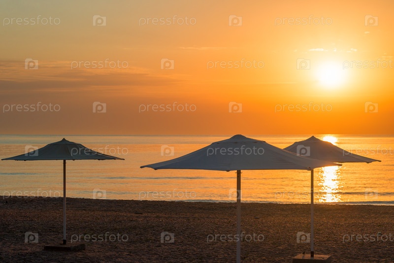 Ряд пляжных зонтиков на песчаном пляже у моря утром
