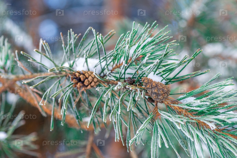 Ветка хвойного дерева, посыпанная снегом в лесу крупным планом зимой