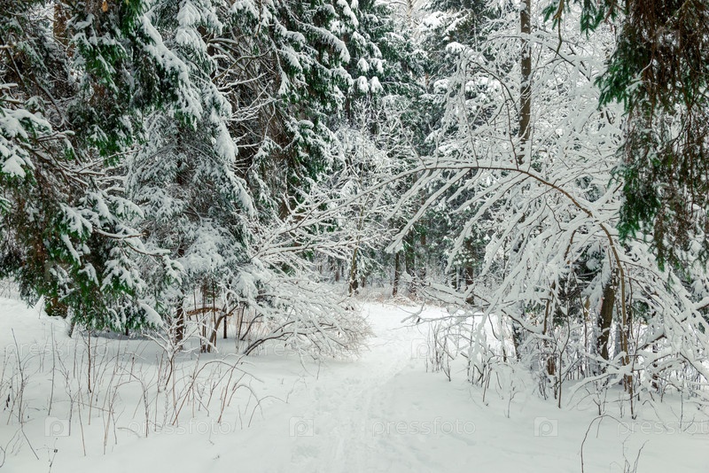 Пейзаж, красивый зимний смешанный лес покрыт белым снегом