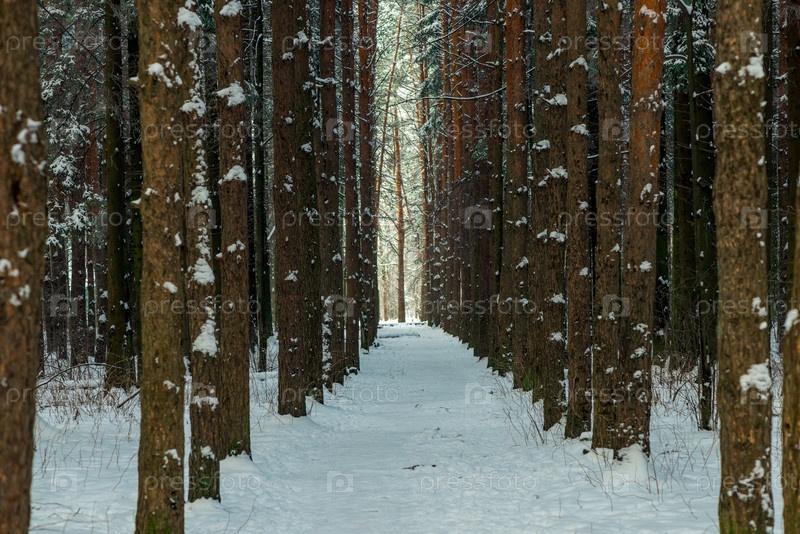 Живописная аллея в снежном лесу, широкая дорога в зимнем лесу