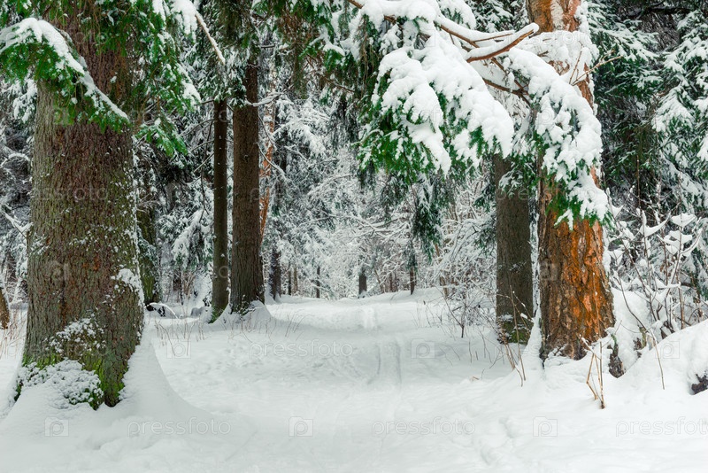 Живописная аллея в снежном лесу, широкая дорога в зимнем лесу