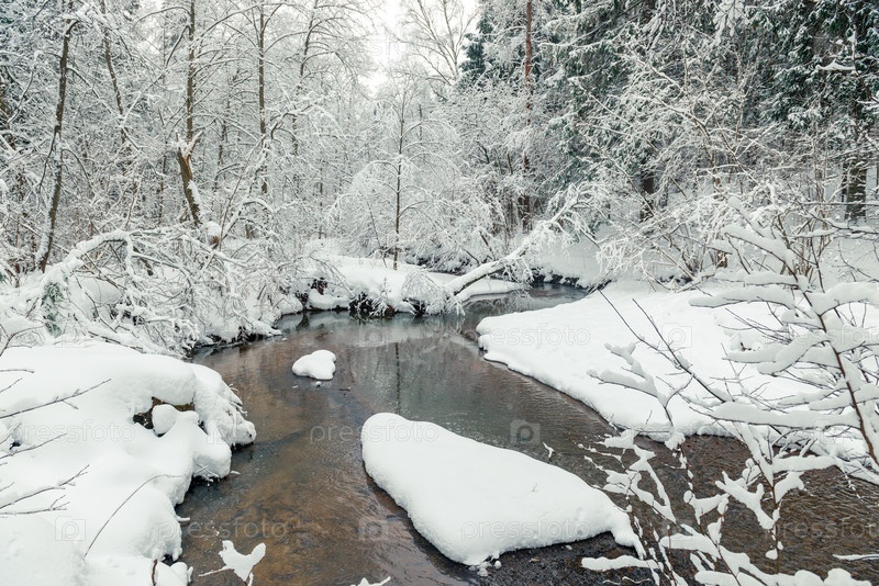 Снежный зимний лес и текущая река. Живописный пейзаж в зимний день в лесу