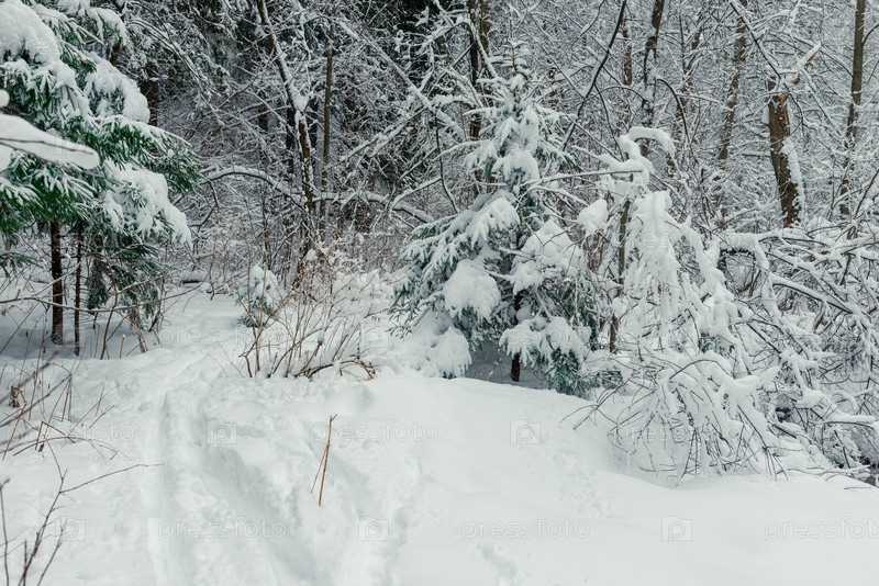 Пейзаж, красивый зимний смешанный лес покрыт белым снегом