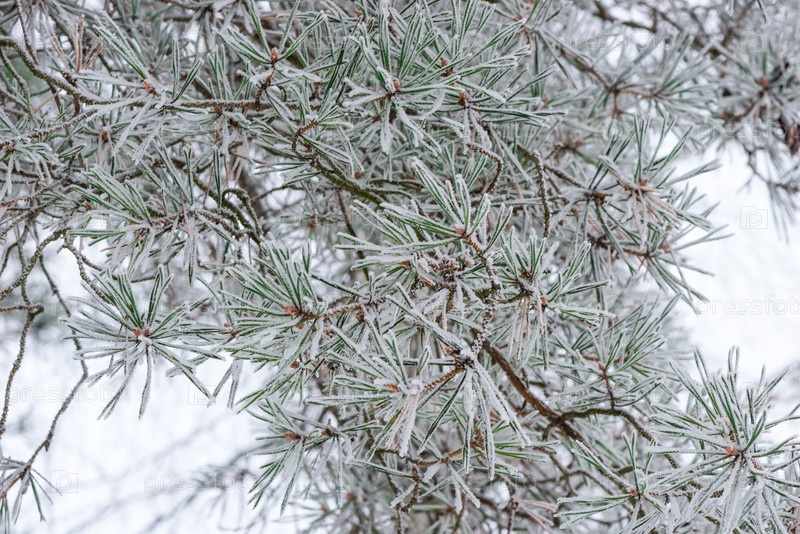 Ветка хвойного дерева, посыпанная снегом в лесу крупным планом зимой