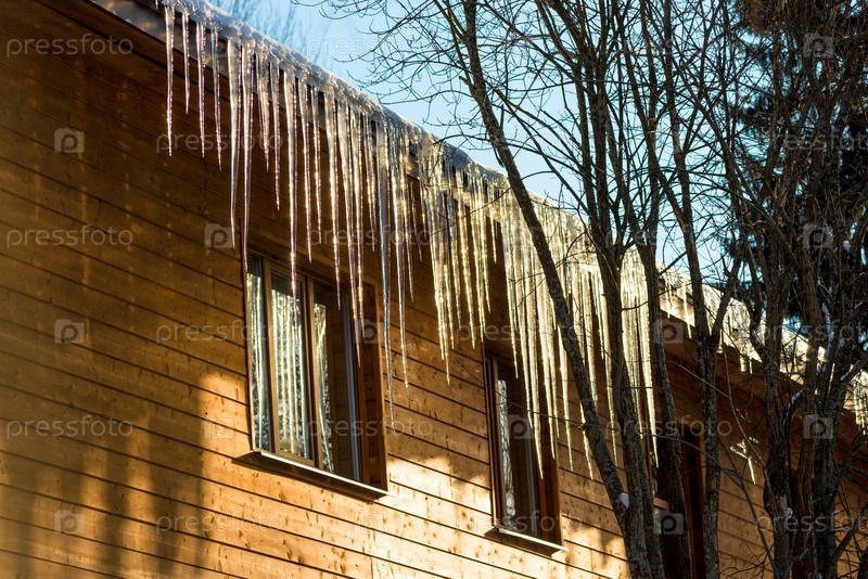 Большие сосульки свисают с крыши дома. Опасные большие сосульки на доме