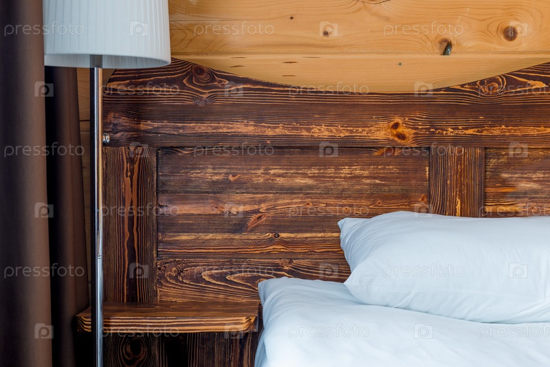 Утренняя сцена в спальне с металлической настольной лампой и подушкой на кровати