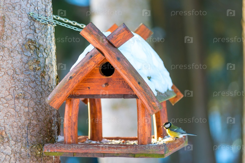 Красивая маленькая птичка большая сиська сидит на кормушке птицы зимой