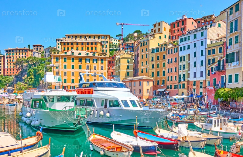 Лодки и корабли в порту города Камогли