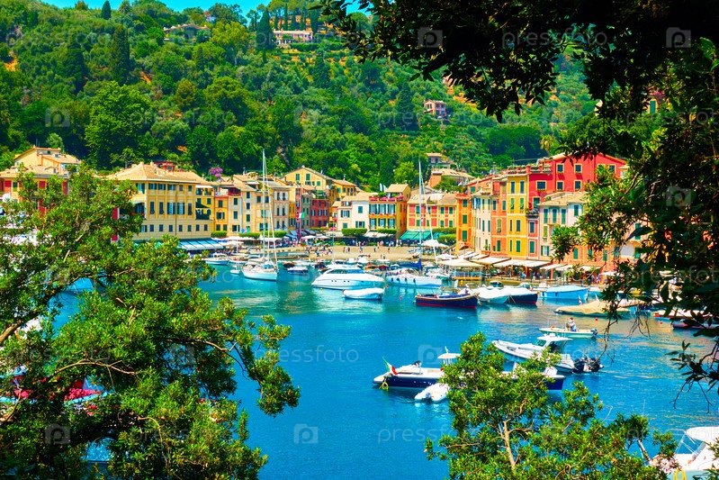 Город Портофино и гавань с лодками