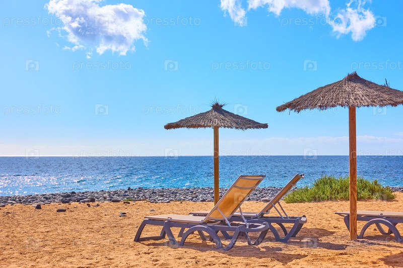 Пляж с зонтиками и шезлонгами у моря