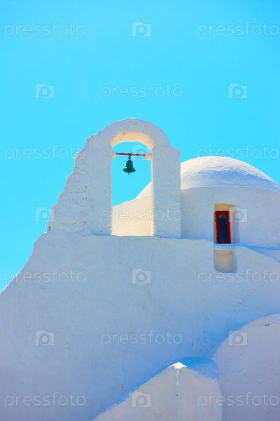 Купол и колокольня церкви Панагия Парапортиани на острове Миконос против светло-голубого неба, Греция - архитектурные детали