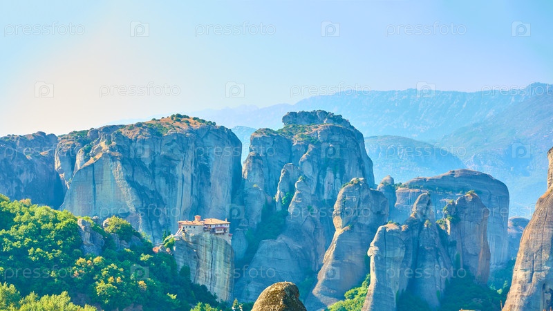Панорама скал Метеоры с монастырем Русану