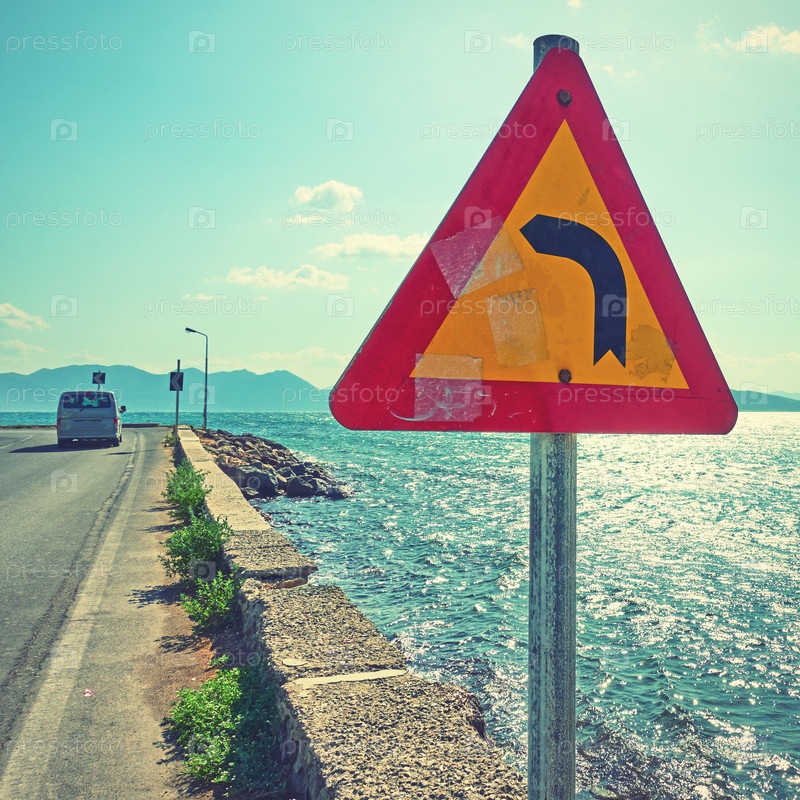Дорожный знак на углу дороги у моря