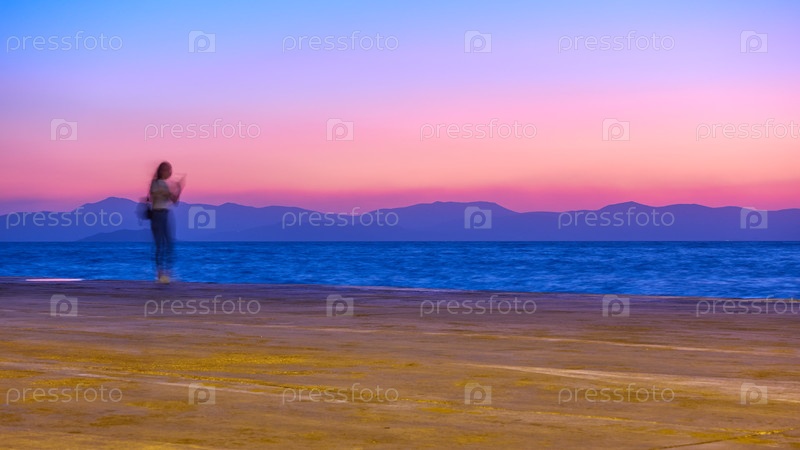 Закат над Эгейским морем на острове Эгина и девушка на пристани, Греция, Длинная экспозиция, движение размыто